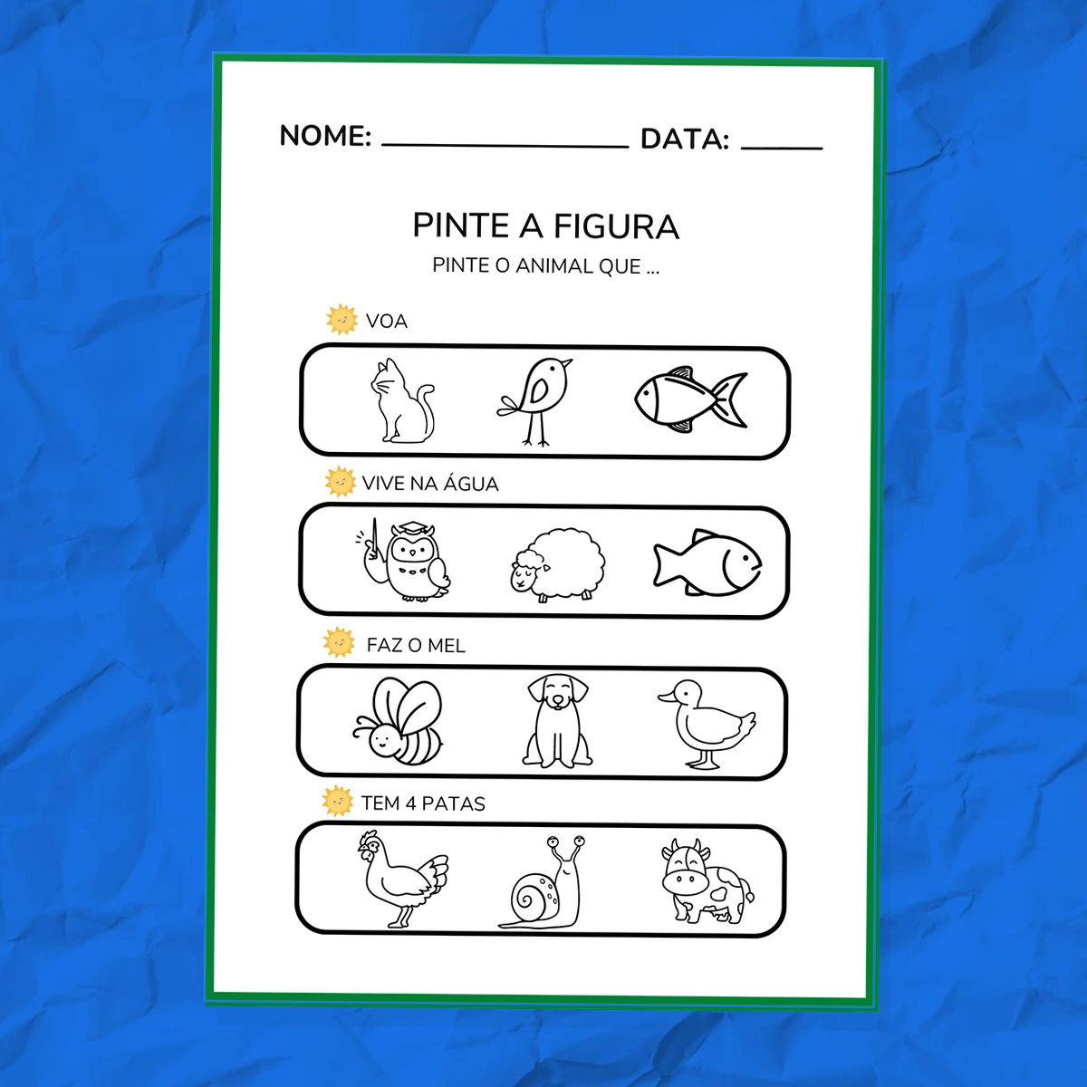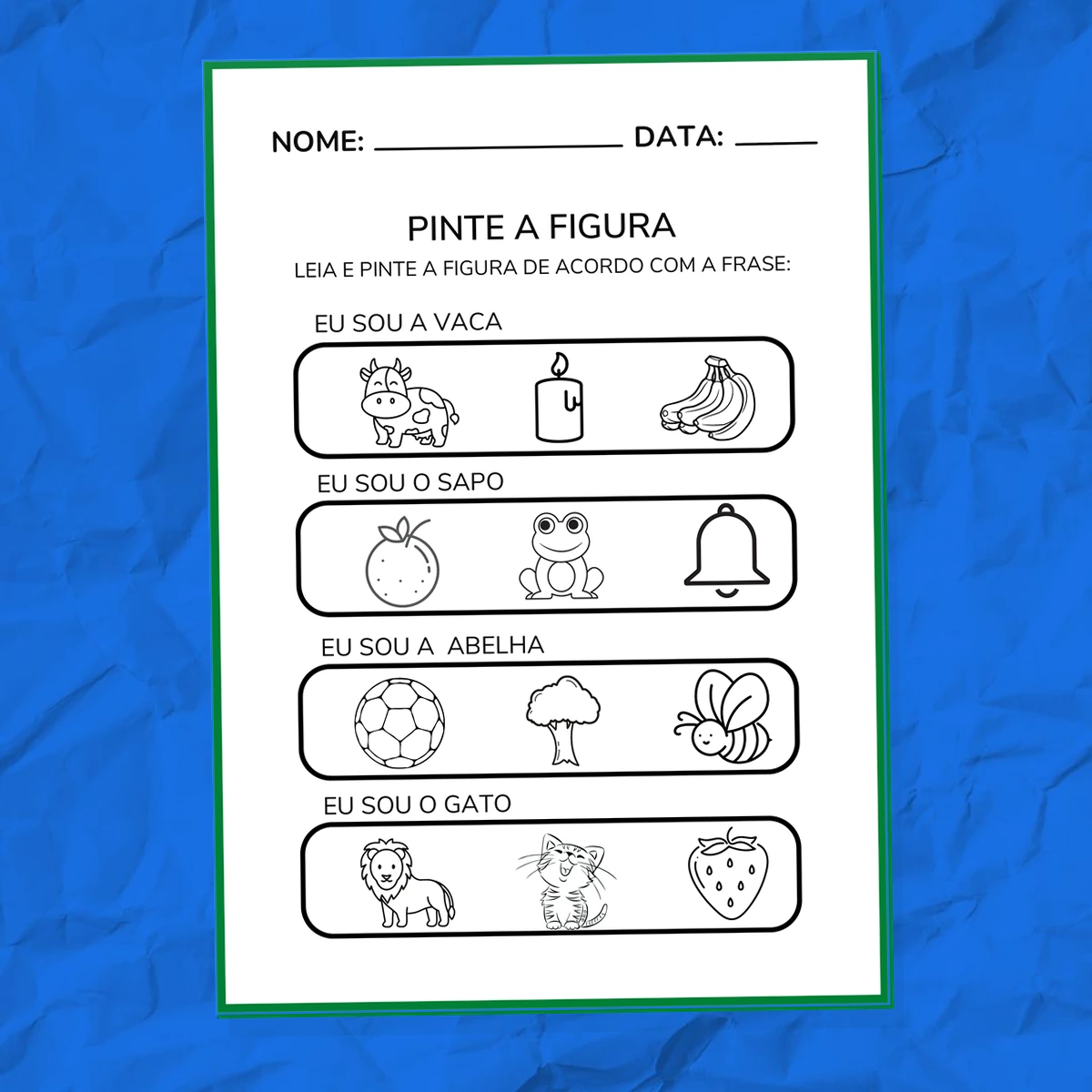 Recurso pedagógico (PDF) que une leitura e arte. A criança deve ler frases curtas (‘Eu sou a vaca’) e pintar o animal correspondente. Incentiva a interpretação de texto.