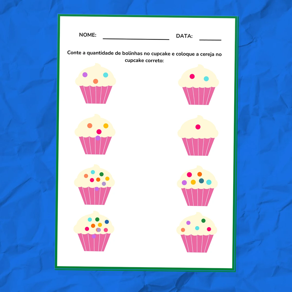 Arquivo digital (PDF) multitarefa. Inclui colagem, pintura de letras específicas, contagem de 1 a 10 (cerejas em cupcakes) e somas iniciais.