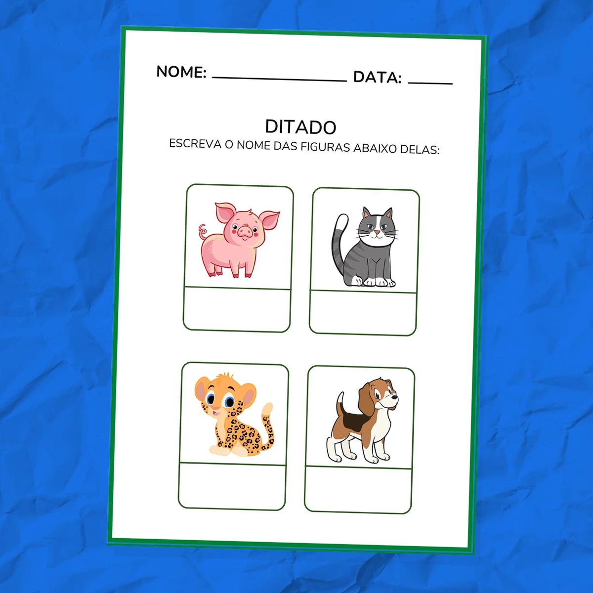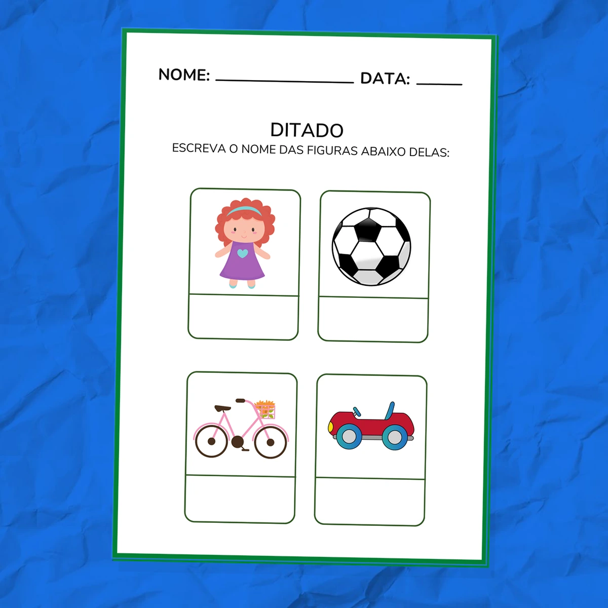 Uma atividade clássica e essencial. O ditado mudo (ou visual) força a criança a acessar seu repertório mental para escrever o nome da figura sem auxílio de banco de palavras.