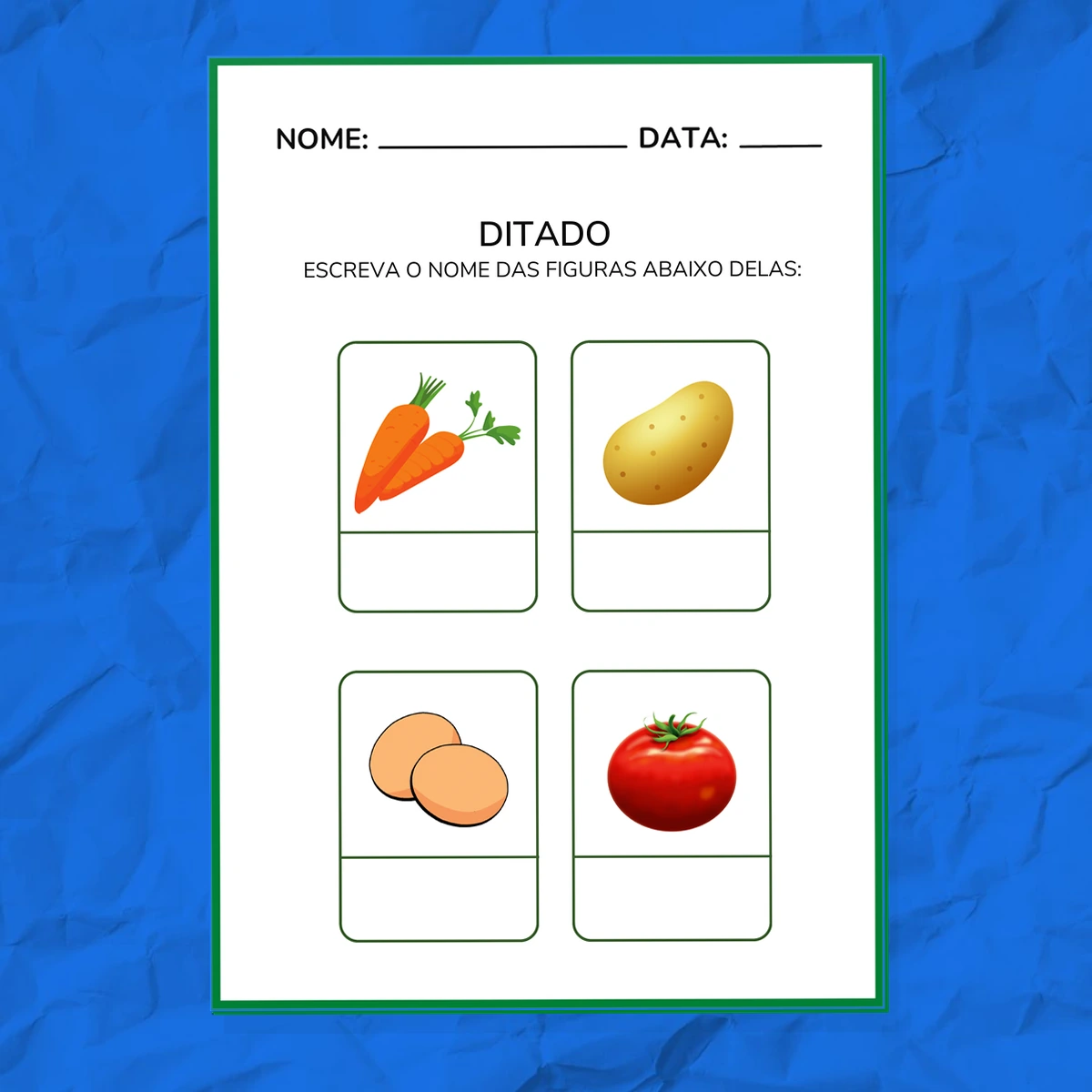 Recurso pedagógico (PDF) de ditado visual. O aluno vê a figura e deve escrever seu nome corretamente. Excelente para avaliar o nível de escrita e ortografia.