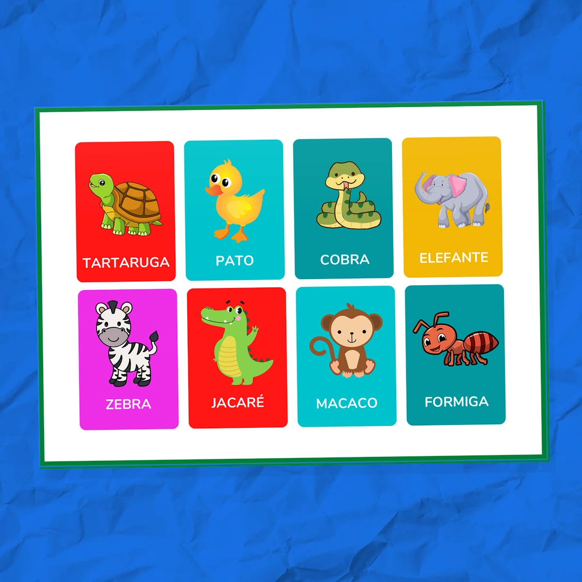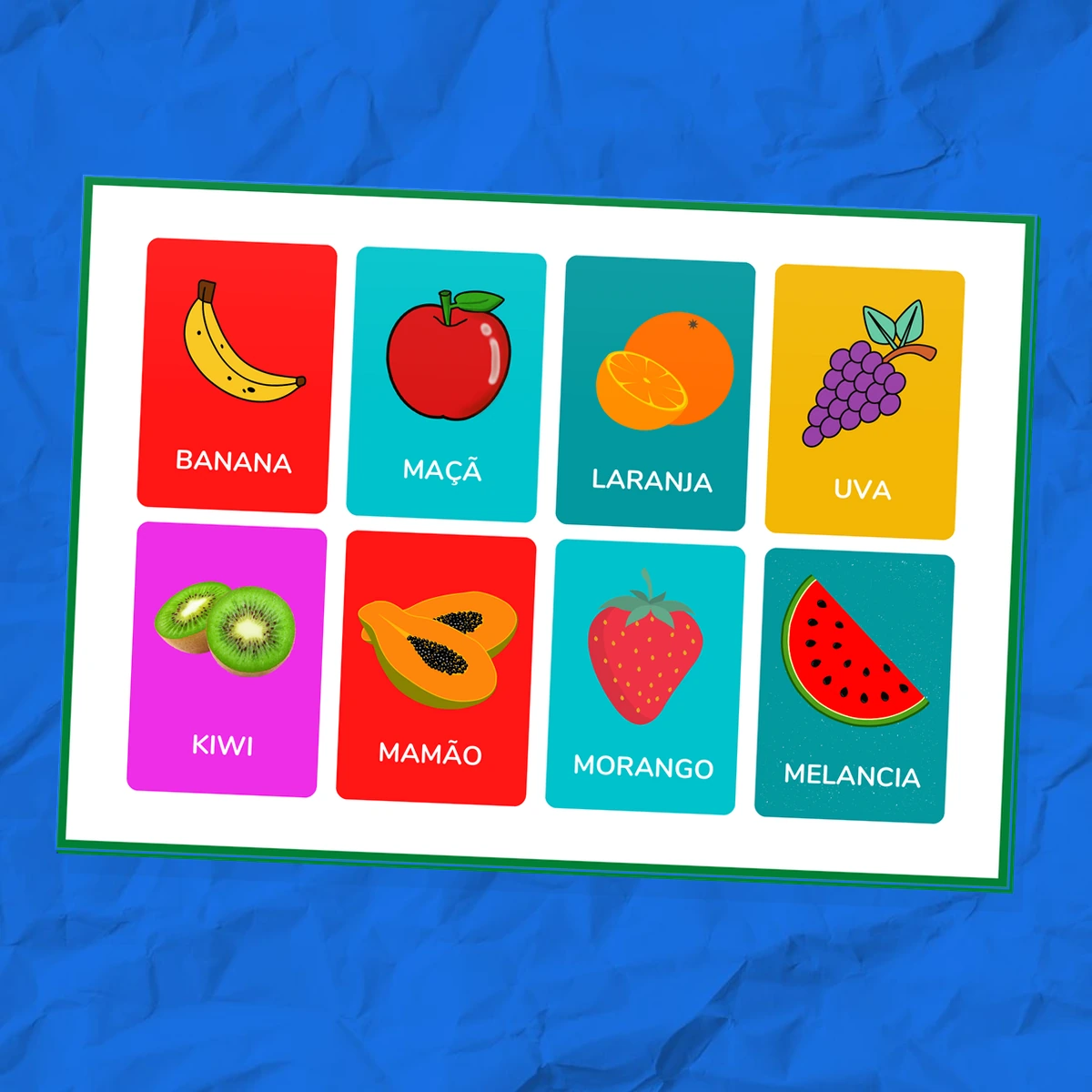 Arquivo digital (PDF) com cards para recortar. Temas de frutas e animais para jogos de memória, ampliação de vocabulário e associação imagem-palavra.