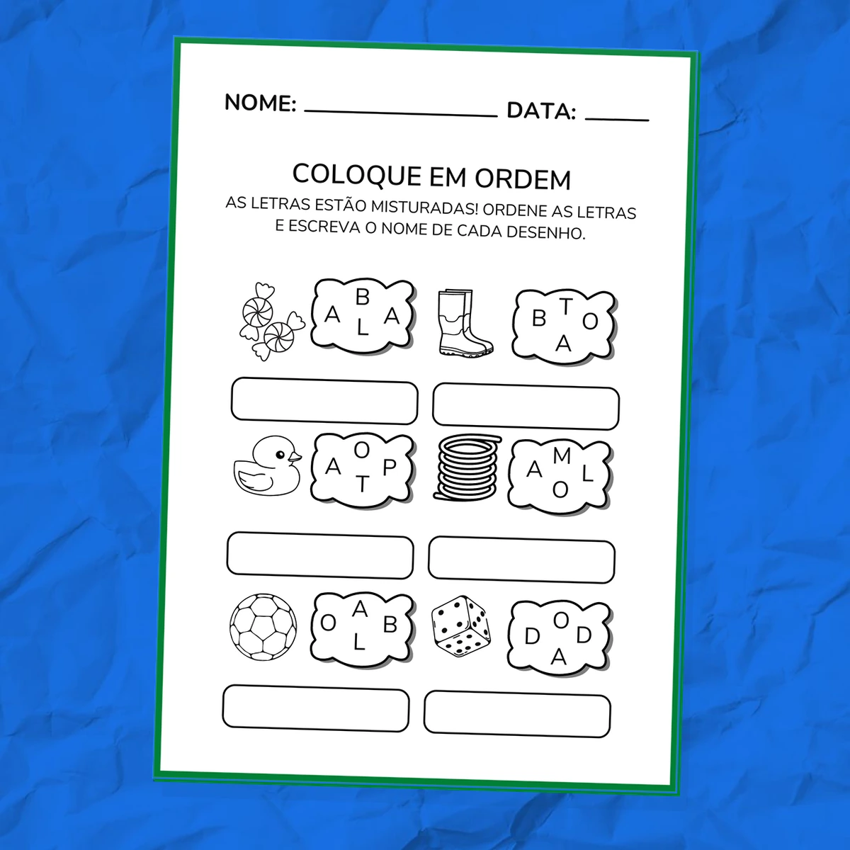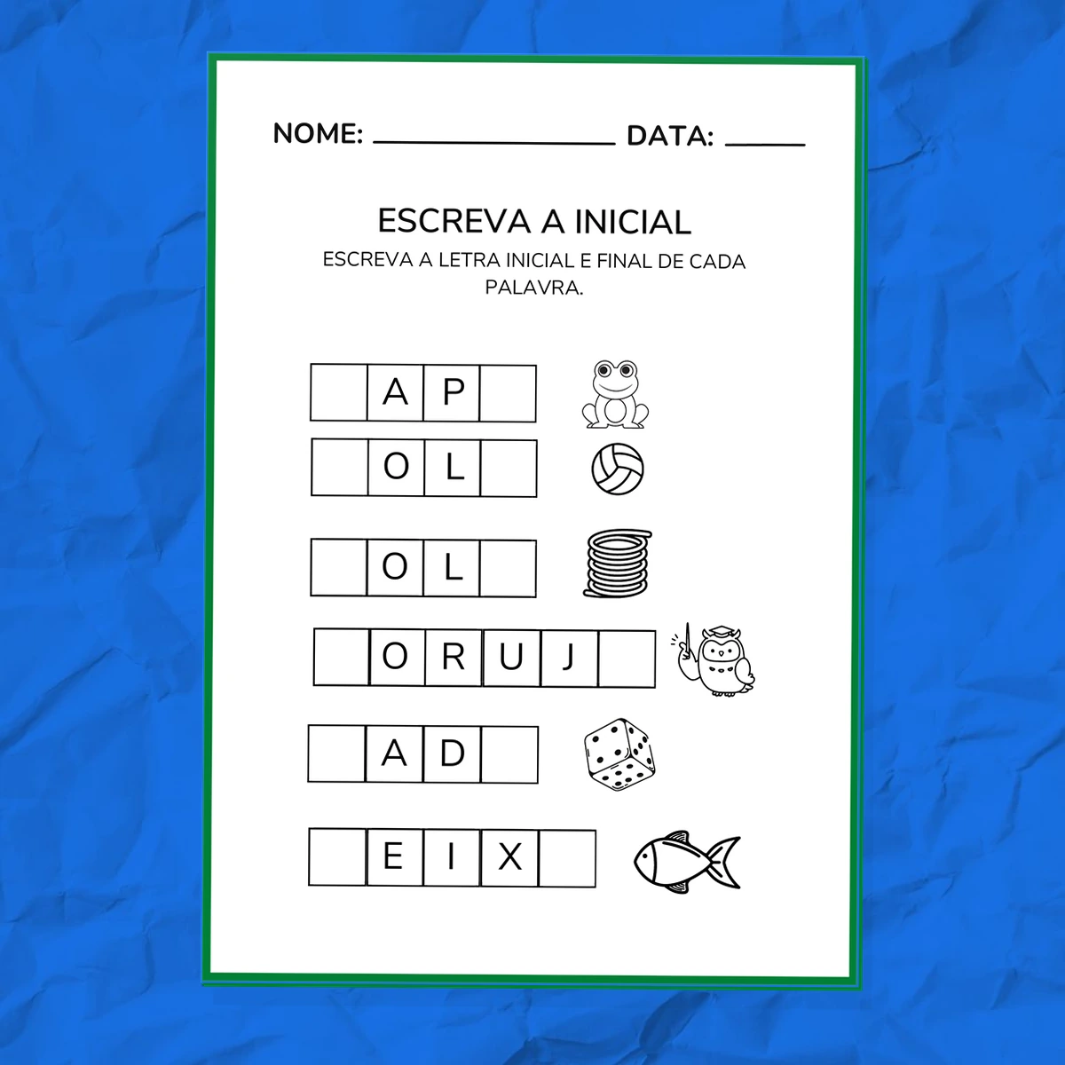 Arquivo digital (PDF) completo para estruturação de palavras. Atividades de identificar letra inicial/final, ordenar sílabas misturadas e completar lacunas.