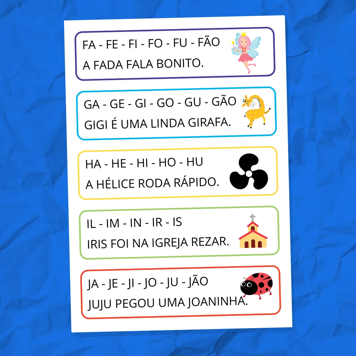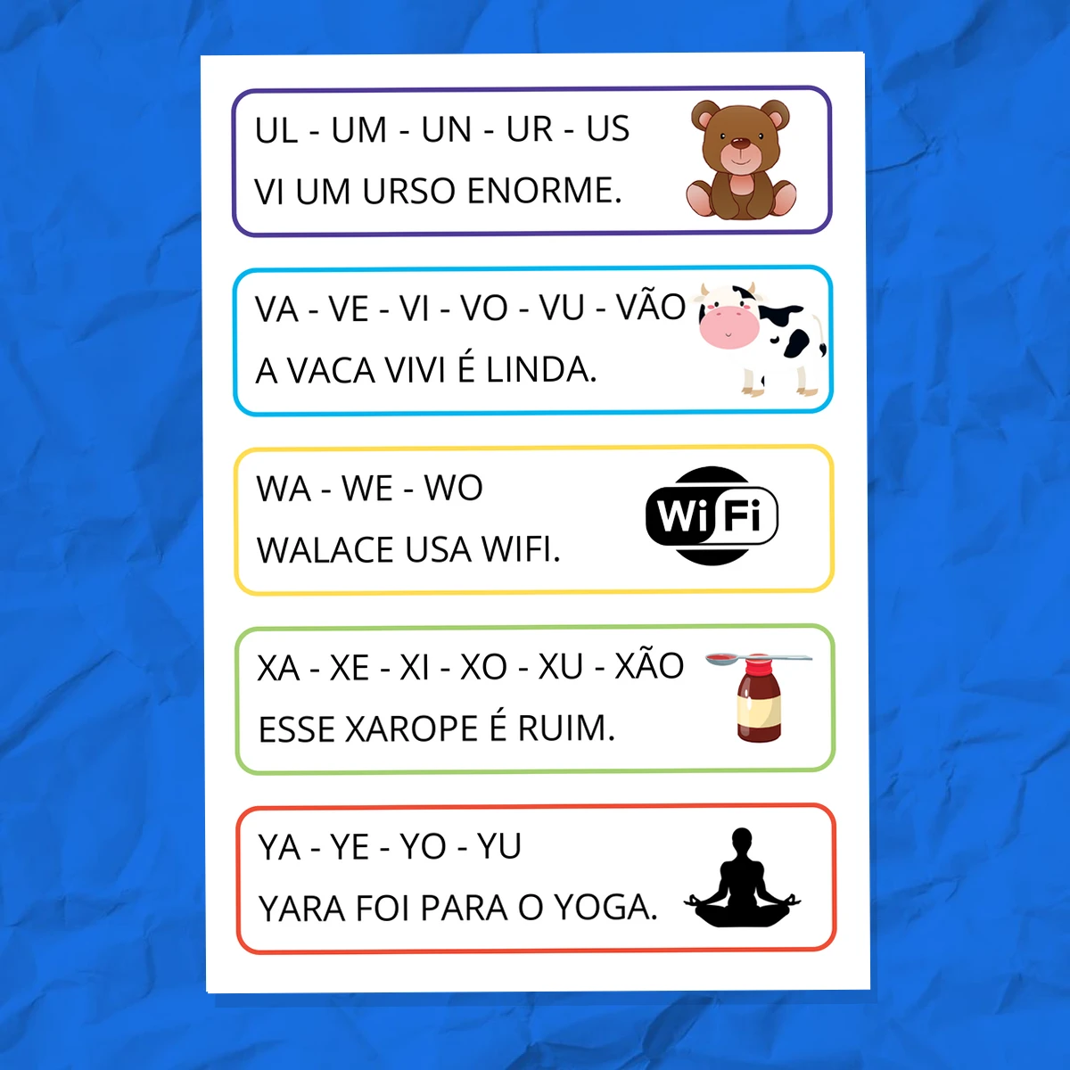 Material pedagógico para alfabetização que combina sílabas com frases ilustrativas, desenvolvendo consciência fonológica e leitura inicial. Organizado por grupos silábicos com exemplos contextuais, ideal para crianças em fase de letramento.
