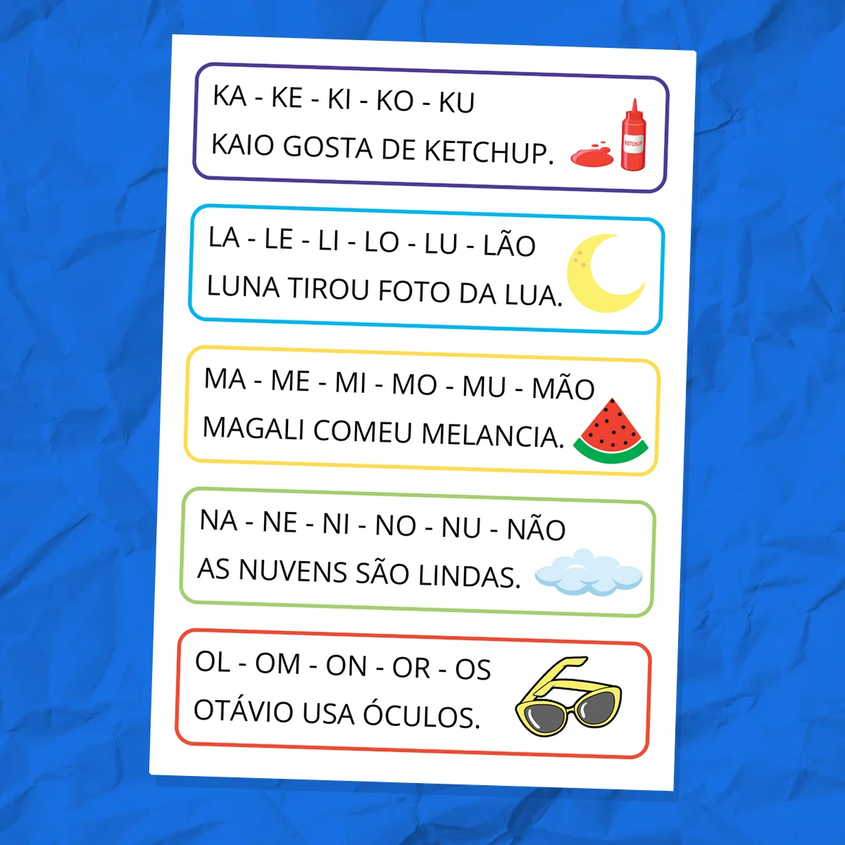O formato de tiras facilita a manipulação e organização do material, permitindo diversas configurações de atividades. A combinação de sílabas e frases cria uma ponte natural entre o reconhecimento de unidades sonoras menores e a compreensão de textos mais extensos, fundamentais para o sucesso no processo de alfabetização.